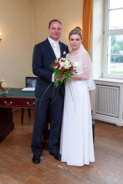 Als Steven um 11:00 Uhr am Standesamt ankam, konnte man ihm seine Nervosität förmlich ansehen. Zur Trauung waren die Familie und engste Freunde eingeladen, so dass jeder schnell seinen Platz im Standesamt fand. Leider konnten die Eltern von Anna nicht dabei sein, so hatte der Bruder der Braut die Ehre, sie dem zukünftigen Ehemann zu übergeben. Die Trauung war gespickt von kleinen Anekdoten über das Brautpaar und endete mit dem lang ersehnten "Ja"-Wort.